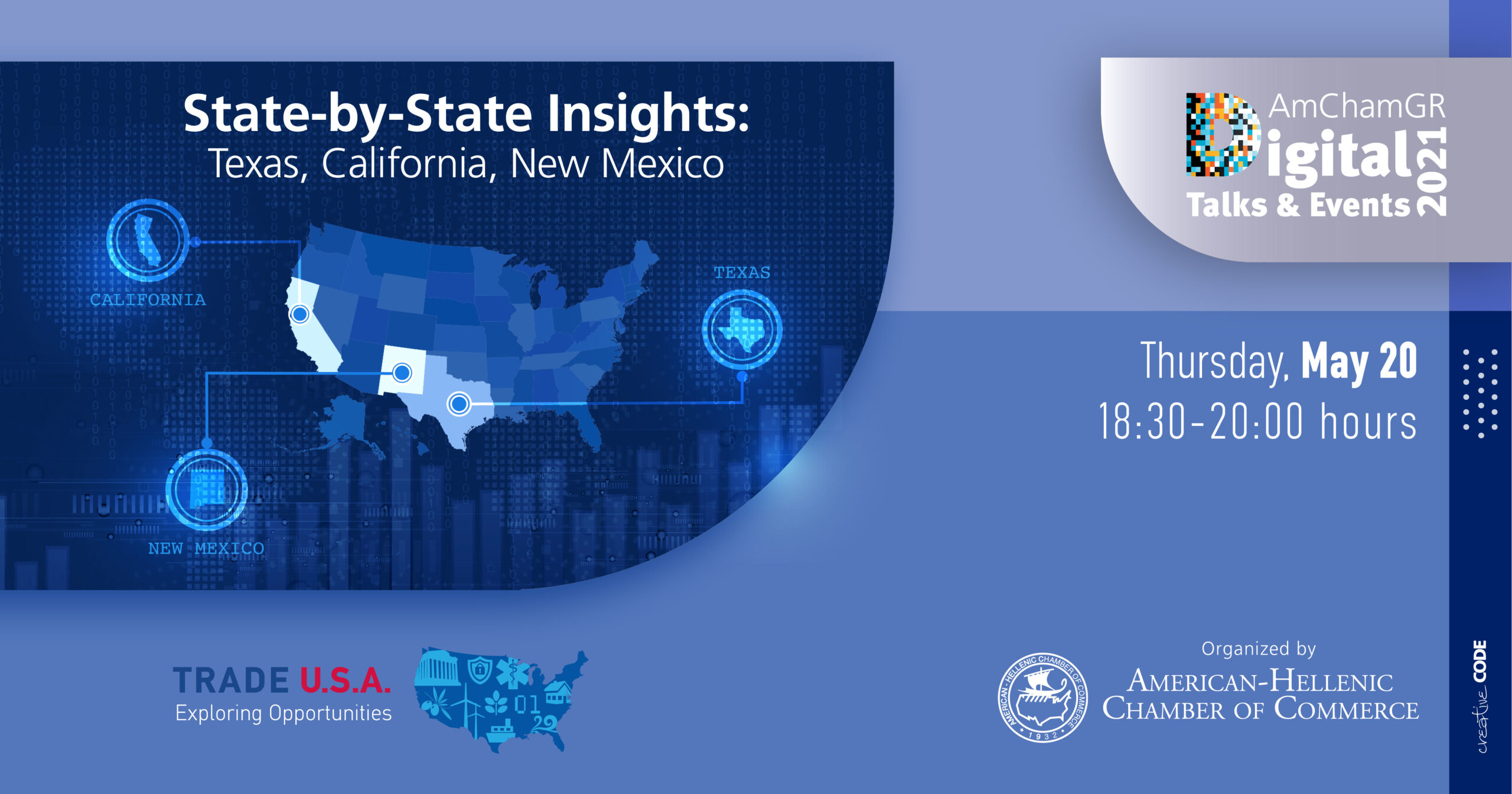Το Ελληνοαμερικανικό Επιμελητήριο διοργανώνει την Πέμπτη, 20 Μαΐου 2021 την διαδικτυακή εκδήλωση Trade USA State-by State Insights: Texas, California, New Mexico, με έμφαση στις εμπορικές σχέσεις των Πολιτειών του Τέξας, της Καλιφόρνια και του Νέου Μέξικο.