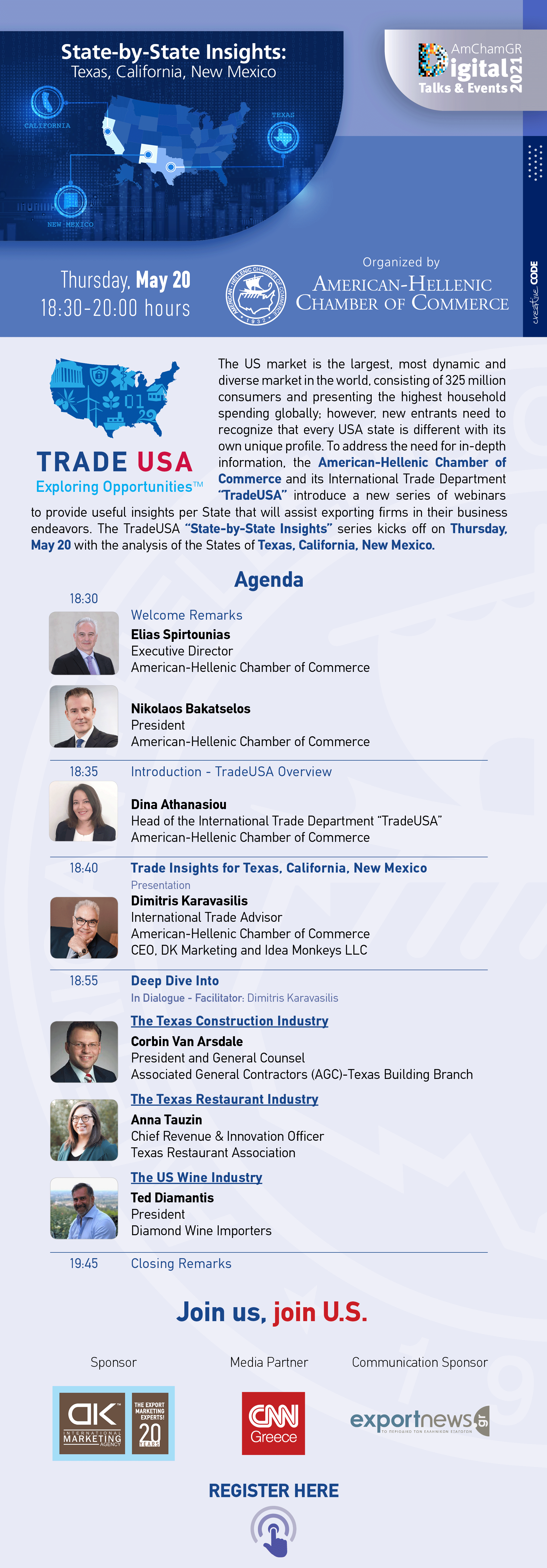 Εγγραφείτε στην διοργάνωση μέσω του συνδέσμου: https://www.amcham.gr/events/event/tradeusa-state-by-state-insights-texas-california-new-mexico/