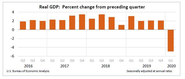 Σύμφωνα με την εκτίμηση του U.S. Bureau of Economic Analysis που εκδόθηκε στα τέλη Απριλίου, το πραγματικό ΑΕΠ μειώθηκε κατά 4,8% (ετήσιος ρυθμός) το πρώτο τρίμηνο του 2020, μετά από αύξηση 2,1% το τέταρτο τρίμηνο του 2019.