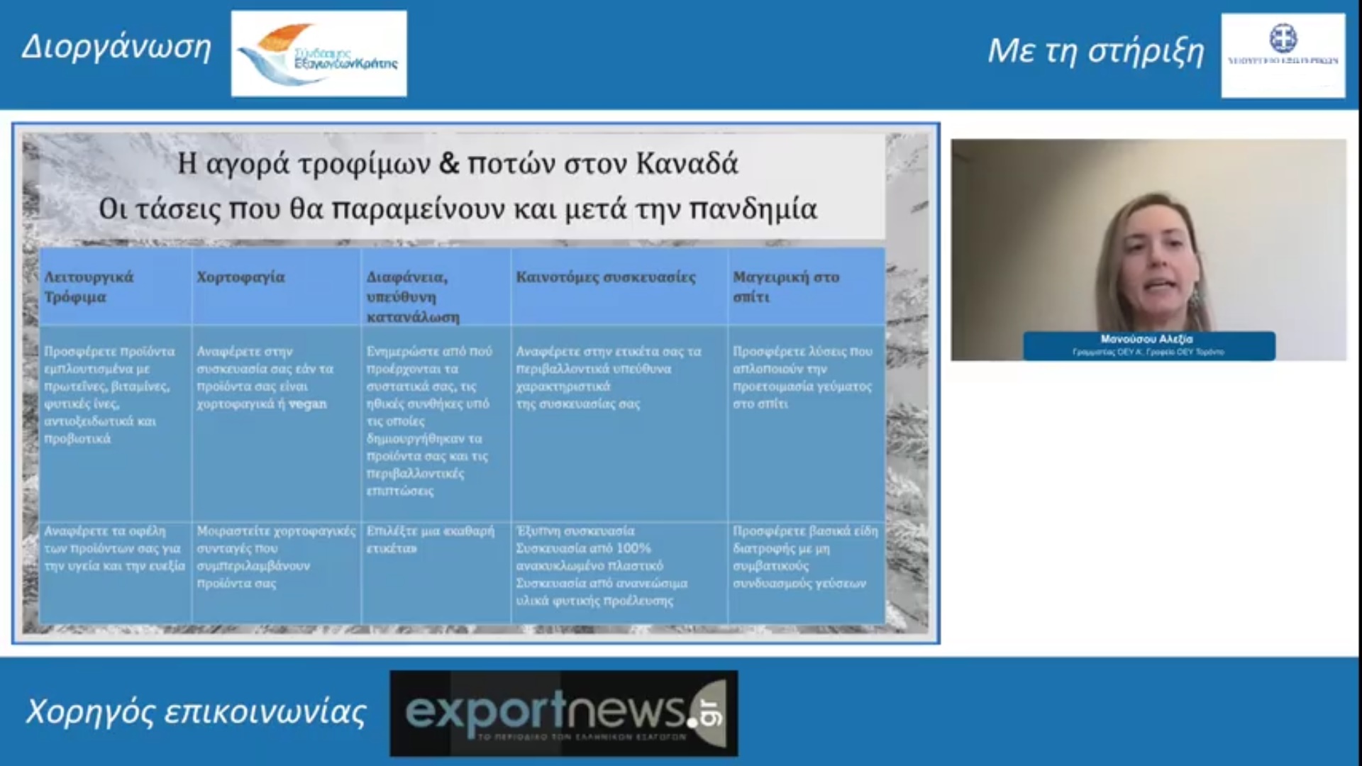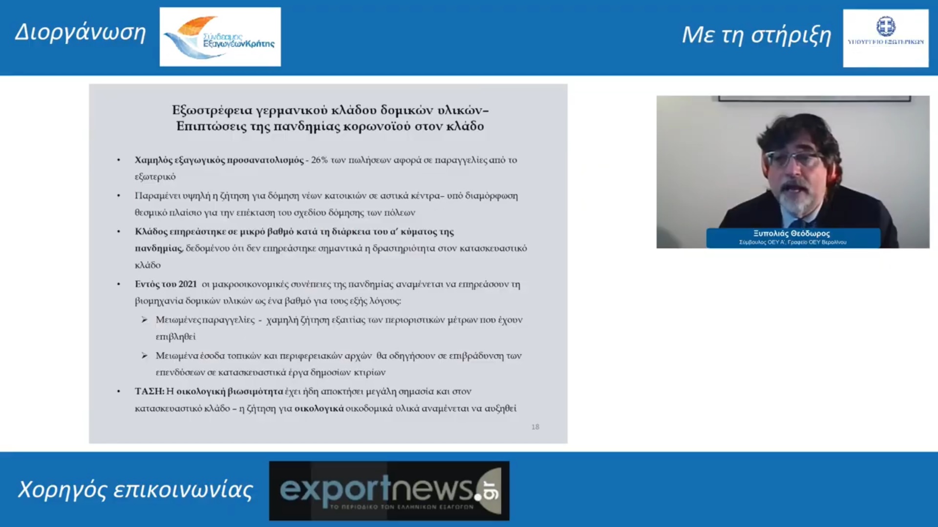 Oλοκληρώθηκε με επιτυχία και ιδιαίτερα μεγάλη συμμετοχή ο πρώτος κύκλος διαδικτυακών ενημερωτικών εκδηλώσεων που διοργάνωσε ο Σύνδεσμος Εξαγωγέων Κρήτης, σε συνεργασία με το Υπουργείο Εξωτερικών και με την υποστήριξη και ευγενική χορηγία των Επιμελητηρίων Ηρακλείου και Χανίων, του Enterprise Greece, του Οργανισμού Ασφάλισης Εξαγωγικών Πιστώσεων, της Eurobank, της Great Exhibitions και της GK Management Group. Οι εκδηλώσεις πραγματοποιήθηκαν στις 24 Φεβρουαρίου, 25 Φεβρουαρίου, 3 Μαρτίου και 10 Μαρτίου στην πλατφόρμα LiveOn, στα πλαίσια της συνεχούς προσπάθειας που καταβάλει ο ΣΕΚ για την τόνωση της εξωστρέφειας και την πληρέστερη ενημέρωση των Ελληνικών εξαγωγικών επιχειρήσεων.