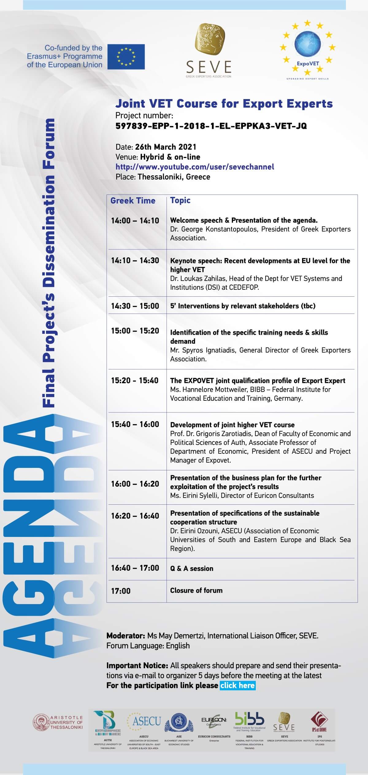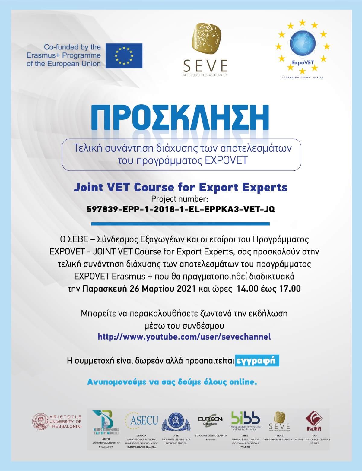Ο ΣΕΒΕ – Σύνδεσμος Εξαγωγέων και οι εταίροι του Προγράμματος EXPOVET – JOINT VET Course for Export Experts, σας προσκαλούν στην τελική συνάντηση διάχυσης των αποτελεσμάτων του προγράμματος EXPOVET Erasmus + που θα πραγματοποιηθεί διαδικτυακά την Παρασκευή 26 Μαρτίου 2021 και ώρες 14.00 έως 17.00.