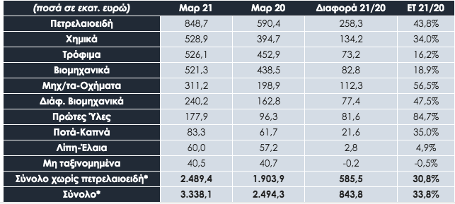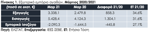 Σύμφωνα με τα στοιχεία της ΕΛΣΤΑΤ, οι εξαγωγές της χώρας ανήλθαν σε €3.338,1 εκατ. και αυξήθηκαν κατά 34,6%, δηλαδή €858,3 εκατ. συγκριτικά με τον Μάρτιο του 2020, όταν διαμορφώθηκαν σε €2.479,8 εκατ. Αντίστοιχα, ανοδική κατά 31,6%, δηλαδή €1.304,1 εκατ. ήταν και η πορεία των εισαγωγών που ανήλθαν σε €5.428,4 εκατ. τον Μάρτιο του 2021 έναντι €4.124,3 εκατ. τον αντίστοιχο μήνα του 2020, όταν έγιναν εμφανή τα πρώτα σημάδια της εξάπλωσης του COVID-19 στη χώρα μας. Το έλλειμμα του εμπορικού ισοζυγίου διαμορφώθηκε σε €2.090,3 εκατ. έναντι €1.644,5 εκατ. πέρυσι, αυξημένο κατά €445,8 εκατ., δηλαδή 27,1%.