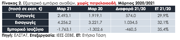 Αν αφαιρέσουμε τα πετρελαιοειδή από τις εμπορευματικές συναλλαγές της χώρας, η εικόνα δεν διαφοροποιείται σημαντικά. Συγκεκριμένα, οι εξαγωγές χωρίς τα πετρελαιοειδή αυξήθηκαν κατά 29,9%, δηλαδή €574,0 εκατ. και ανήλθαν σε €2.493,1 εκατ. έναντι €1.919,1 εκατ. τον Μάρτιο του 2020, ενώ οι εισαγωγές διαμορφώθηκαν σε €4.256,2 εκατ. φέτος έναντι €3.221,7 εκατ. πέρυσι, σημειώνοντας θετική μεταβολή κατά €1.034,5 εκατ., δηλαδή 32,1%. Το εμπορικό ισοζύγιο παρουσίασε έλλειμμα €1.763,1 εκατ., αυξημένο κατά €460,5 εκατ., δηλαδή 35,4% συγκριτικά με τον Μάρτιο του 2020.
