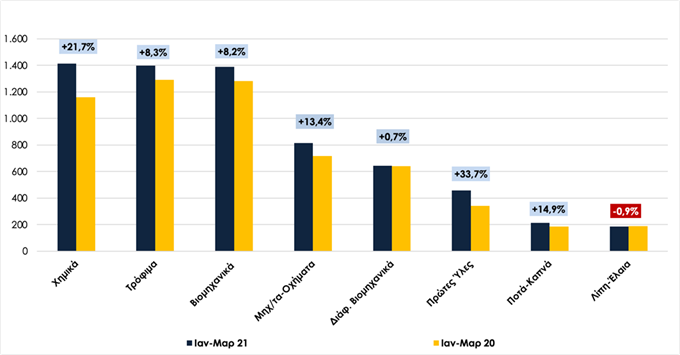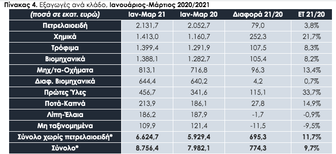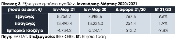 Αναφορικά με την πορεία των εμπορευματικών συναλλαγών της Ελλάδας στο διάστημα Ιανουάριος-Μάρτιος του 2021, αυτές κρίνονται ιδιαίτερα θετικές και ενισχυμένες. Πιο αναλυτικά, οι εξαγωγές διαμορφώθηκαν σε €8.756,2 εκατ. στο α’ τρίμηνο του 2021 έναντι €7.988,6 εκατ. στο α’ τρίμηνο του 2020, με την αύξηση να ανέρχεται σε €767,6 εκατ., δηλαδή 9,6%. Οι εισαγωγές διαμορφώθηκαν σε €13.490,4 εκατ. φέτος έναντι €13.236,0 εκατ. πέρυσι, δηλαδή αυξημένες κατά €254,4 εκατ., δηλαδή 1,9%, ενώ το εμπορικό ισοζύγιο παρέμεινε ελλειμματικό κατά €4.734,2 εκατ., μειωμένο ωστόσο κατά €513,2 εκατ., δηλαδή 9,8%. Χωρίς τα πετρελαιοειδή, οι ελληνικές εξαγωγές αυξήθηκαν κατά 11,5%, δηλαδή €684,2 εκατ. και διαμορφώθηκαν σε €6.644,9 εκατ., ενώ οι εισαγωγές αυξήθηκαν κατά 5,2%, δηλαδή €524,0 εκατ. και ανήλθαν στο ποσό των €10.580,5 εκατ.