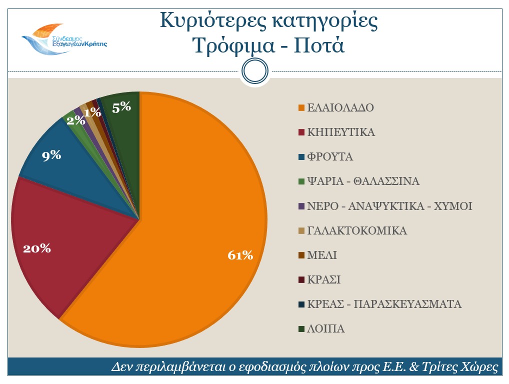 Στον αγροδιατροφικό τομέα, το Ελαιόλαδο έφτασε τα 147,5 εκ. ευρώ, παρουσιάζοντας αύξηση 24,2%, τα Κηπευτικά τα 47,8 εκ. ευρώ με αύξηση 2,8% και τα Φρούτα τα 22,3 εκ. ευρώ και αύξηση 20,5%. Μικρότερα ποσοστά καταλαμβάνουν τα Ψάρια & Θαλασσινά, η κατηγορία των Νερών – Αναψυκτικών – Χυμών, τα Γαλακτοκομικά, το Μέλι, το Κρασί και το Κρέας & Παρασκευάσματά του.