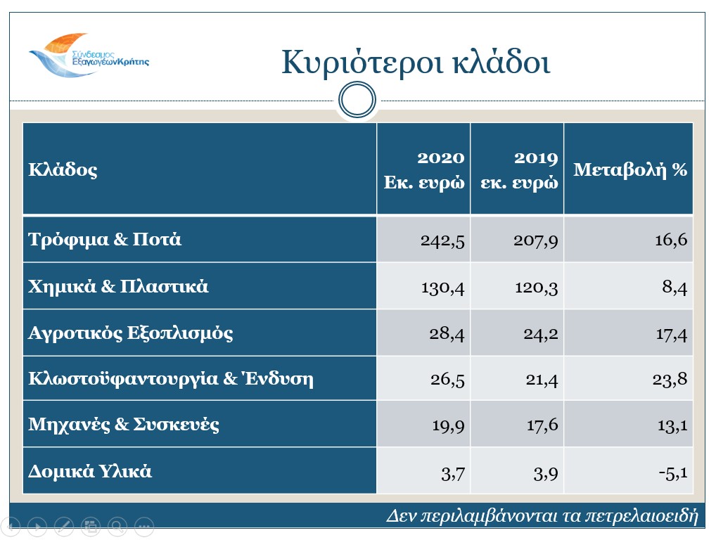 Το 2020 αποτέλεσε μια πολύ καλή χρονιά για τις εξαγωγές της Κρήτης, με αύξηση μεγαλύτερη από την αύξηση του συνόλου των ελληνικών εξαγωγών, η οποία οριακά άγγιξε το 3%. Μέσα σε ένα πολύ δύσκολο επιχειρηματικό περιβάλλον, με συνθήκες παγκοσμίως πρωτόγνωρες λόγω της πανδημίας, οι Κρήτες εξαγωγείς κατάφεραν να ανταπεξέλθουν και σημείωσαν σημαντικότατες εξαγωγικές επιδόσεις, τοποθετώντας την Κρήτη και τα προϊόντα της σε δυναμικές αγορές. Η εντυπωσιακή αυτή πορεία, που είχε φανεί ήδη από τα στοιχεία που λαμβάναμε κατά τη διάρκεια του έτους, αποτελεί καθοριστικό παράγοντα για την ανάκαμψη της τοπικής οικονομίας και αναδεικνύει την Κρήτη για το 2020 ως μία από τις πιο δυναμικές εξαγωγικές Περιφέρειες της Ελλάδας.
