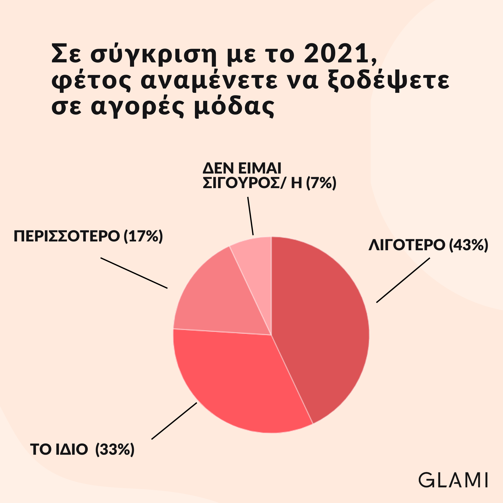 Παρόλο που το 69% των ερωτηθέντων αντιλαμβάνεται αύξηση στις τιμές προϊόντων μόδας, το 50% δεν το θεωρεί ικανό να τους κάνει να ξοδέψουν λιγότερο σε σχέση με το 2021. Η έρευνα διαπίστωσε επίσης ότι το 43% των Ελλήνων σχεδιάζει να ξοδέψει λιγότερα σε σύγκριση με το 2021 με την πλειοψηφία αυτών να μειώνουν γενικά τις αγορές μόδας (62%) ή να παραμένουν στα ίδια αγοραστικά επίπεδα αλλά αναζητώντας φθηνότερες τιμές (23%). Οι περισσότεροι από αυτούς που έχουν σκοπό να αυξήσουν τις δαπάνες τους (38%), θα ήθελαν να αγοράσουν περισσότερα ή και πιο ακριβά κομμάτια, ενώ το 27% θα αγόραζε λιγότερα προϊόντα αλλά σε υψηλότερες τιμές.
