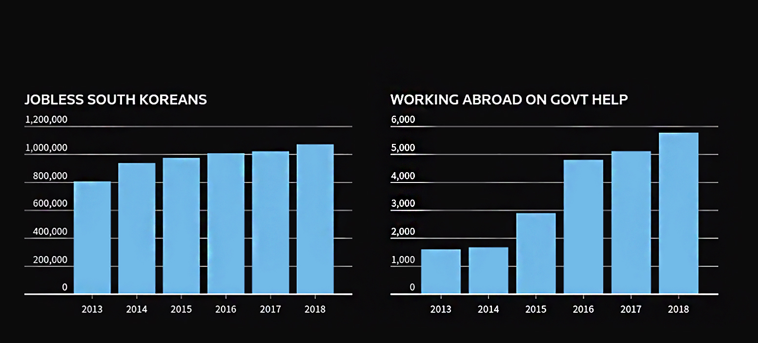 Αριστερά η εξέλιξη της ανεργίας στην Κορέα την τελευταία εξαετία και δεξιά ο αυξανόμενος αριθμός των Κορεατών που βρίσκουν δουλειά στο εξωτερικό με τη βοήθεια της κυβέρνησής τους. Πηγή: Reuters.