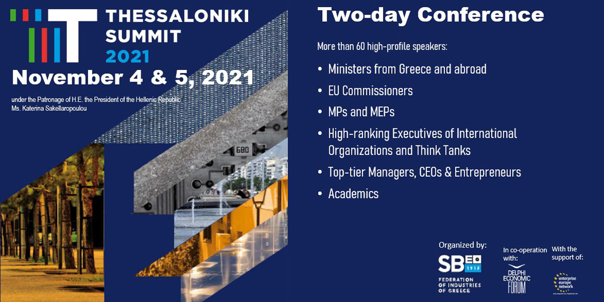 Με περισσότερους από 100 ομιλητές και ομιλήτριες, μεταξύ των οποίων διπλωμάτες, υπουργοί και υφυπουργοί, στελέχη κοινοτικών οργανισμών και επιχειρηματίες, θα πραγματοποιηθεί αύριο και μεθαύριο στη Θεσσαλονίκη το Thessaloniki Summit 2021, το οποίο διοργανώνουν ο Σύνδεσμος Βιομηχανιών Ελλάδος (ΣΒΕ) και το Οικονομικό Φόρουμ των Δελφών, υπό την αιγίδα της Προέδρου της Δημοκρατίας, Κατερίνας Σακελλαροπούλου. Οι εργασίες του διήμερου συνεδρίου, στο οποίο θα έχουν την τιμητική τους η ανάκαμψη των οικονομιών από την πανδημία, η περιοχή των Βαλκανίων, οι επενδύσεις, η τεχνολογία και ο ψηφιακός μετασχηματισμός, θα αναμεταδίδεται ζωντανά μέσω της ιστοσελίδας https://www.thessalonikisummit.gr/.
