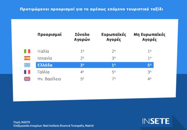 Πρώτη στην προτίμηση των ταξιδιωτών και δυνητικών ταξιδιωτών από τις ευρωπαϊκές αγορές, αναφορικά με το ποια χώρα θα επιθυμούσαν να επισκεφθούν στο αμέσως επόμενο ταξίδι τους προς Ευρώπη, βρίσκεται η Ελλάδα, με μικρή διαφορά από την Ιταλία, ενώ η Ισπανία κατατάσσεται στην τρίτη θέση, σύμφωνα με έρευνα που διεξήγαγε το Royal Elcano Institute και η Turespaña της Ισπανίας.