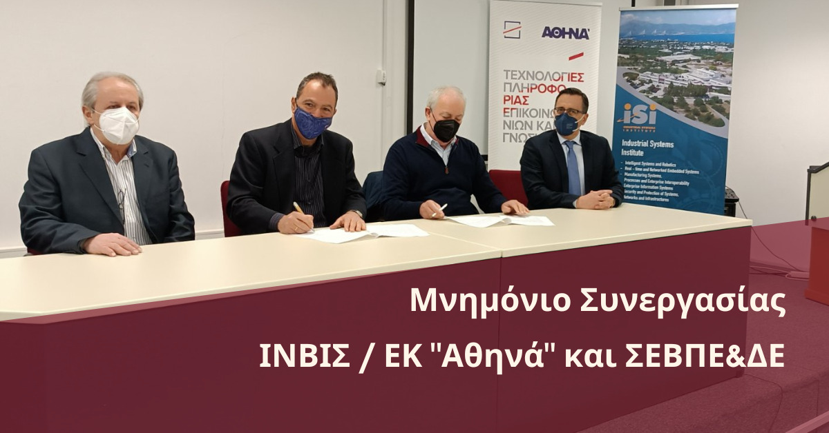 Μνημόνιο Συνεργασίας υπεγράφη σήμερα, 14 Φεβρουαρίου 2022, μεταξύ του Ερευνητικού Κέντρου “Αθηνά”/ Ινστιτούτο Βιομηχανικών Συστημάτων (ΙΝΒΙΣ) και του Συνδέσμου Επιχειρήσεων και Βιομηχανιών Πελοποννήσου και Δυτικής Ελλάδος (ΣΕΒΠΕ&ΔΕ) με στόχο τη στενότερη συνεργασία ερευνητικής και επιχειρηματικής κοινότητας.