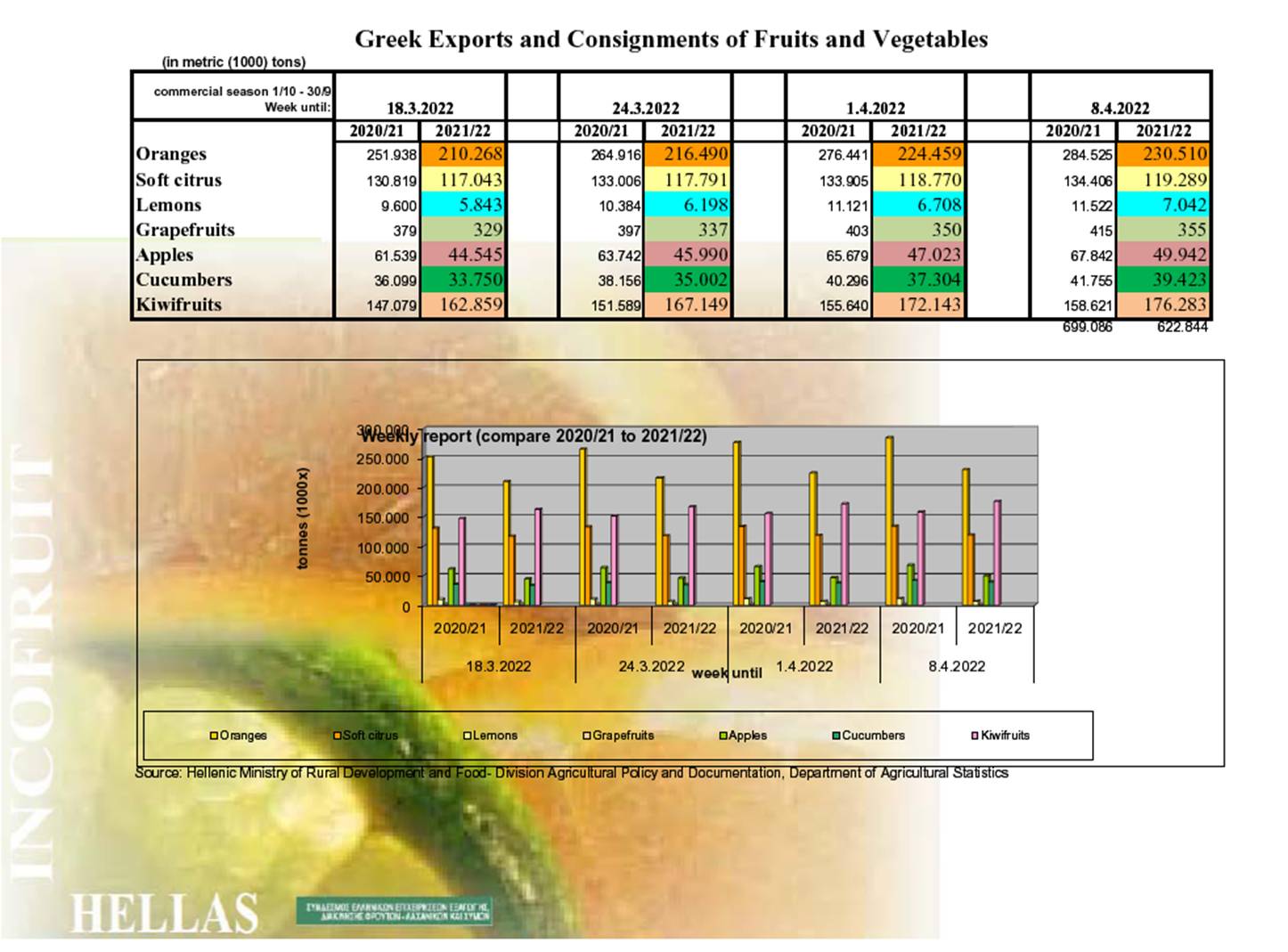 Οι ροές των εξαγωγών μας μέχρι 8/4/2022 παρουσιάζει σημαντική μείωση έναντι της αντίστοιχης περσινής της τάξης του -10,9% παρά την μικρή βελτίωση της ανασκοπούμενης εβδομάδος τελευταίας εβδομάδος κατά 3,1% έναντι της προηγούμενης , τροφοδότησης της ζήτησης εν όψει του Πάσχα των καθολικών (17/4)
