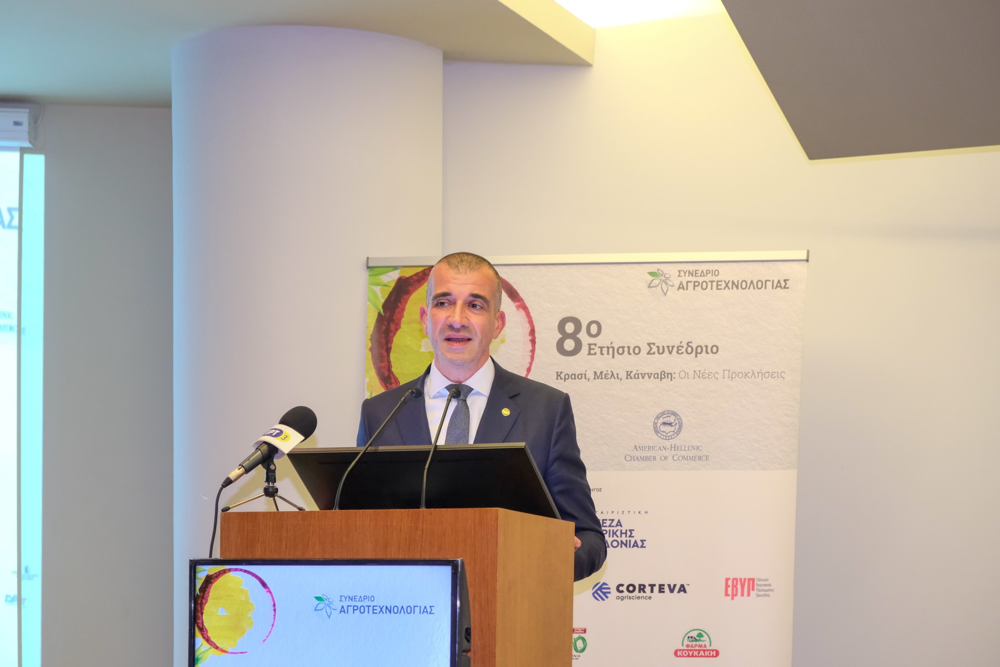 Ο Αντιπρόεδρος του Ελληνο-Αμερικανικού Εμπορικού Επιμελητηρίου κ. Βασίλης Καφάτος δήλωσε από το βήμα του 8ου Συνέδριου Αγροτεχνολογίας: «Η πολυετής κρίση που όπως όλα δείχνουν ξεπερνά επιτέλους η χώρα, πέραν των αρνητικών συνεπειών, είχε θετικό αντίκτυπο που μπορούμε να αξιοποιήσουμε. Βοήθησε τους Έλληνες αγρότες και παραγωγούς να συνειδητοποιήσουν ότι χρειάζεται να λειτουργήσουν ως επιχειρηματίες και να στραφούν στην ποιότητα, στο επώνυμο προϊόν και τις διεθνείς αγορές προκειμένου να αξιοποιήσουν τα ιδιαίτερα και μοναδικά χαρακτηριστικά των Ελληνικών προϊόντων» και συνέχισε «Φέτος αποφασίσαμε να εστιάσουμε σε τρία προϊόντα με ιδιαίτερα χαρακτηριστικά τα οποία πιστεύουμε ότι μπορούν να αναπτυχθούν περαιτέρω. Πρόκειται για το μέλι που αξίζει να τεθεί περισσότερο στο επίκεντρο, την κάνναβη όπου γεννιέται μια καινοτόμος και εξωστρεφής αγορά, και το κρασί, όπου μπορεί να κατακτήσει μια ακόμη πιο σημαντική θέση στην διεθνή αγορά»