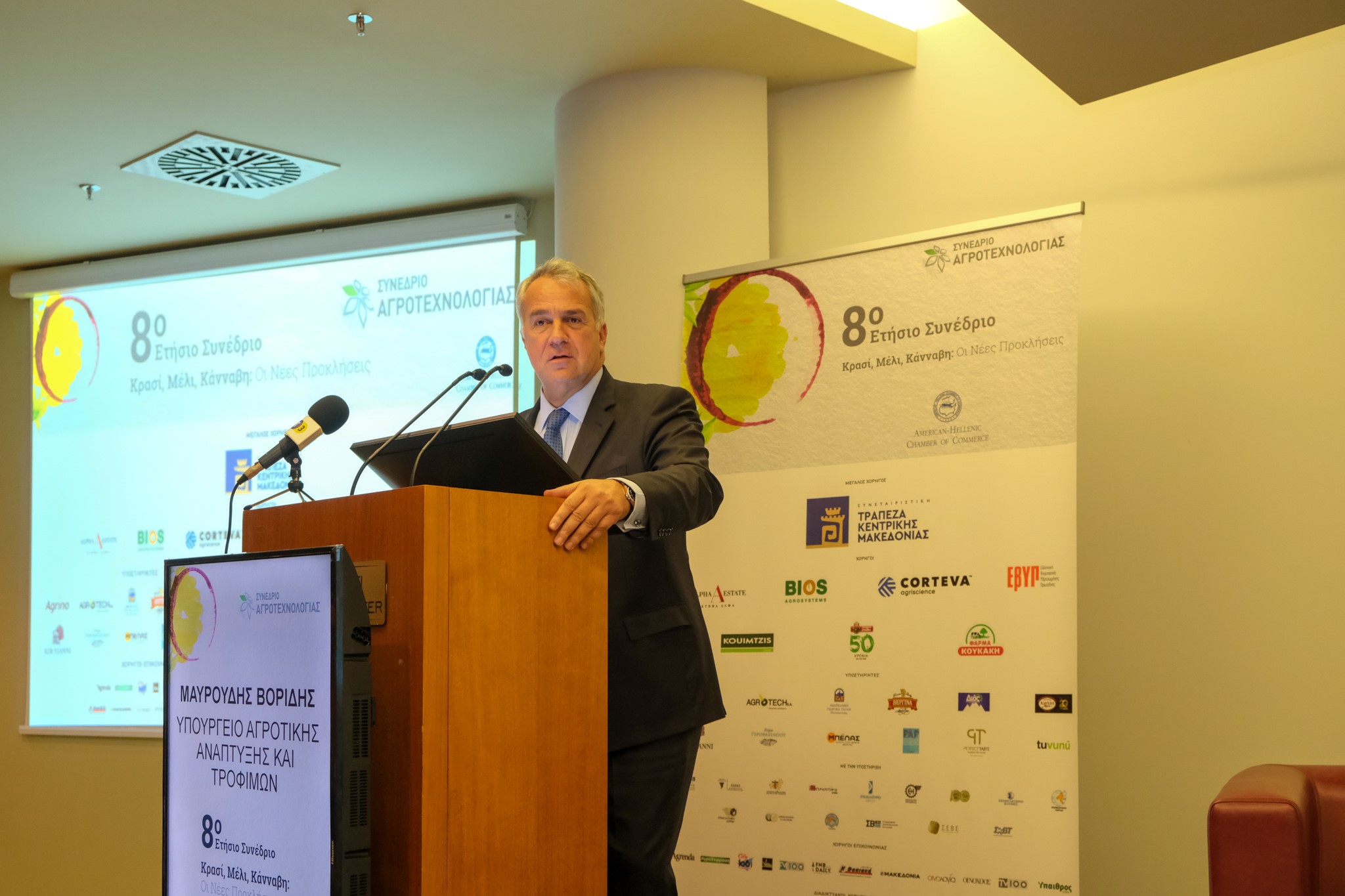 Ο Υπουργός Αγροτικής Ανάπτυξης και Τροφίμων, κ. Μάκης Βορίδης από το βήμα του 8ου Συνεδρίου Αγροτεχνολογίας έκανε εκτενή αναφορά στα προϊόντα που εστίασε το φετινό συνέδριο αναλύοντας το σχέδιο του Υπουργείου για το μέλι, το κρασί και την κάνναβη και προανήγγειλε αυστηρότερους ελέγχους με σκοπό να αποφευχθεί η νοθεία προϊόντων. Ιδιαίτερη αναφορά έκανε ο Υπουργός και στο φιλόδοξο σχέδιο για την άρδευση το οποίο θα σχεδιάσει από κοινού το υπουργείο Υποδομών και το υπουργείο Αγροτικής Ανάπτυξης και επίσης τόνισε την ανάγκη νέας Κοινής Αγροτικής Πολιτικής η οποία θα συνδέεται με το περιβάλλον και την κλιματική αλλαγή.