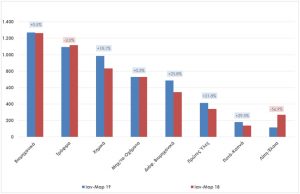 Οι εξαγωγές στον κλάδο των τροφίμων παρουσίασαν μείωση κατά 2,0%, δηλαδή €21,9 εκατ., ενώ επίσης καθοδική ήταν και η πορεία των εξαγωγών λιπών και ελαίων κατά 56,9%, ήτοι €154,0 εκατ. στο α’ τρίμηνο 2019. Αντίθετα, οι υπόλοιποι κλάδοι παρουσίασαν αύξηση στην εξαγωγική τους επίδοση και συγκεκριμένα τα βιομηχανικά κατά 0,5%, δηλαδή €6,8 εκατ., τα χημικά κατά 18,1%, δηλαδή €151,0 εκατ., τα μηχανήματα και οχήματα κατά 0,3%, δηλαδή €2,1 εκατ., τα διάφορα βιομηχανικά προϊόντα κατά 25,8%, δηλαδή €140,8 εκατ., οι πρώτες ύλες κατά 21,8%, δηλαδή €74,1 εκατ. και τα ποτά και καπνά κατά 29,5%, δηλαδή €41,1 εκατ.