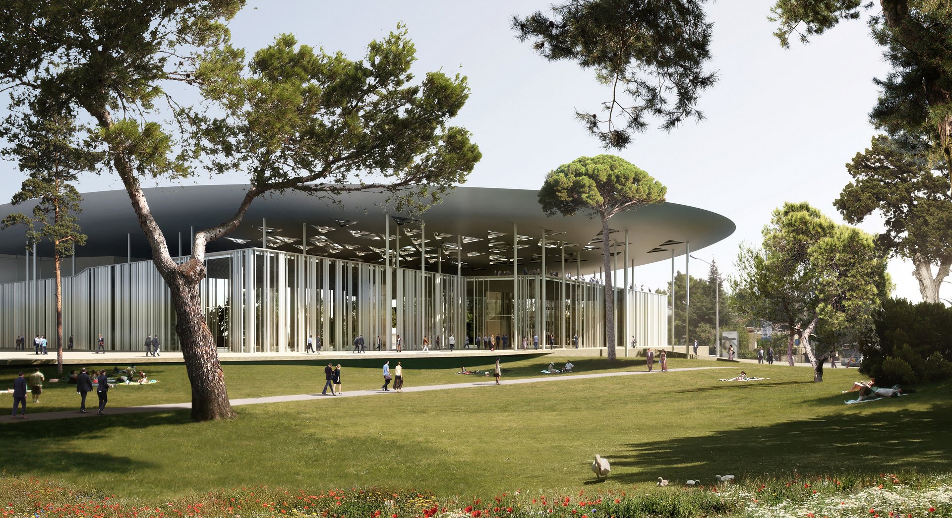 Η σχεδιαστική πρόταση που έλαβε το πρώτο βραβείο προβλέπει επίσης τη δημιουργία ανοιχτών ημιυπαίθριων χώρων κάτω από τα στέγαστρα με θέα στο πάρκο και τη θάλασσα. Παράλληλα, τα βιοκλιματικά high-tech στέγαστρα ενσωματώνουν πολλές διαφορετικές χρήσεις, όπως αξιοποίηση του βρόχινου νερού, ηλιακά ενεργειακά συστήματα, κλιματισμό κ.α., εξυπηρετώντας τον επιθυμητό βιοκλιματικό χαρακτήρα των εκθεσιακών εγκαταστάσεων. «Το πράσινο μπορεί και διαχέεται ανάμεσα στα κτίρια, δίνοντας την εντύπωση μεγάλων περιπτέρων μέσα σε πάρκο. Η χωροθέτηση των κτιρίων μάλιστα σέβεται και αναδεικνύει τους ιστορικούς άξονες της Θεσσαλονίκης και επιτρέπει στο αστικό πάρκο να λάβει τέτοια μορφή και ανάπτυξη, ώστε να δημιουργηθεί ένας ενιαίος άξονας πρασίνου» τονίζεται στην ανακοίνωση, όπου επισημαίνεται ακόμα ότι στο χαρτοφυλάκιο έργων των Sauerbruch Hutton, του επικεφαλής αρχιτεκτονικού γραφείου της νικήτριας ομάδας, περιλαμβάνονται, μεταξύ άλλων, το Experimenta, Science Center (Heilbronn, 2019) και το M9 Museum Quarter (Venice Mestre, 2018).