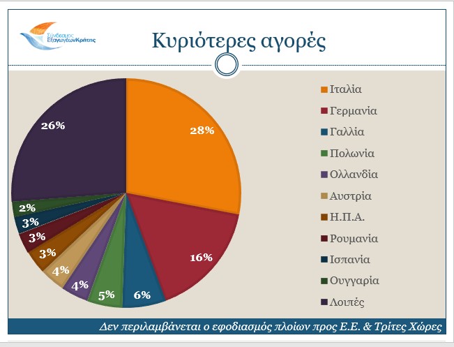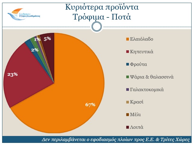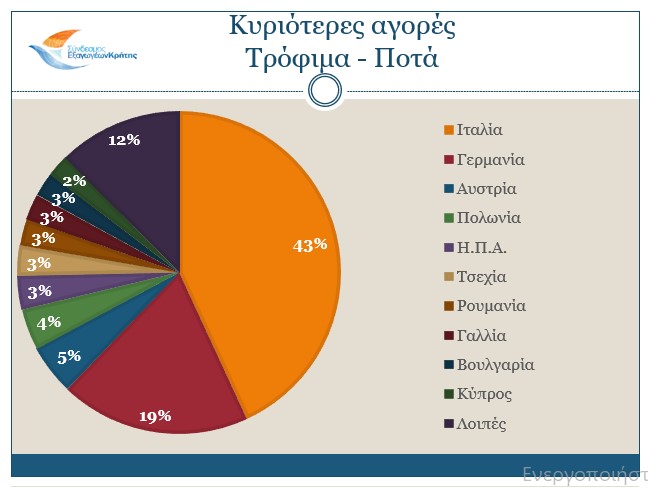 Αναφορικά με τις χώρες όπου αποστέλλονται τα Κρητικά προϊόντα, πρώτη έρχεται η Ιταλία, με μερίδιο 28%, ακολουθεί η Γερμανία με μερίδιο 16,4%, Τρίτη η Γαλλία, με μερίδιο 6,1%, τέταρτη η Πολωνία, με μερίδιο 5% και Πέμπτη η Ολλανδία, με μερίδιο 3,9%. Τη δεκάδα των σημαντικότερων αγοραστών των Κρητικών προϊόντων συμπληρώνουν η Αυστρία (μερίδιο 3,6%), οι Η.Π.Α. (3,4%), η Ρουμανία (2,8%), η Ισπανία (2,4%) και η Ουγγαρία (2,1%).