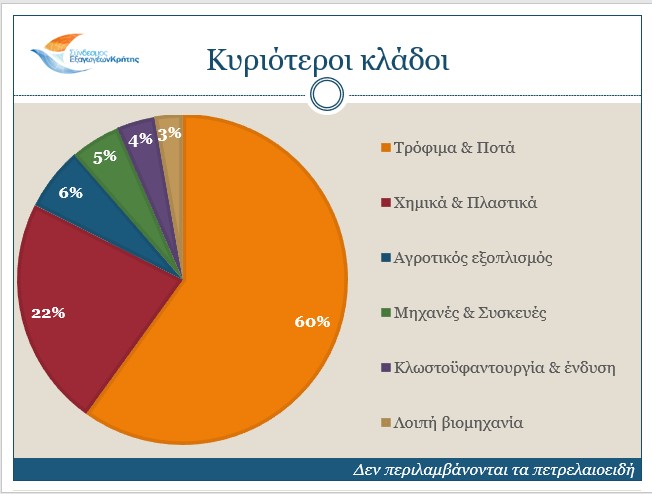 Ο κλάδος των Τροφίμων και Ποτών, ο οποίος αποτελεί το 60% του συνόλου των Κρητικών εξαγωγών κατά την εξεταζόμενη περίοδο, παρουσιάζει αύξηση ίση με 54,2%. Ο κλάδος των Χημικών και Πλαστικών έρχεται δεύτερος, με μερίδιο 22,5% επί του συνόλου των εξαγωγών της Κρήτης και αύξηση της τάξεως του 15%. Το υπόλοιπο 17,5% του συνόλου των Κρητικών εξαγωγών καταλαμβάνουν οι κλάδοι του Αγροτικού Εξοπλισμού, η Κλωστοϋφαντουργία & Ένδυση, οι Μηχανές & Συσκευές, τα Δομικά Υλικά κ.α.