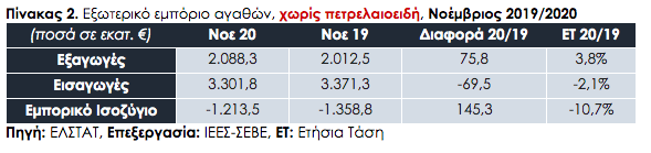 Χωρίς τα πετρελαιοειδή η εικόνα των εξαγωγών είναι σαφώς βελτιωμένη καθώς από €2.012,5 εκατ. τον Νοέμβριο του 2019, ανήλθαν σε €2.088,3 εκατ. τον Νοέμβριο του 2020, με την αύξηση να διαμορφώνεται σε €75,8 εκατ., δηλαδή 3,8%. Οι εισαγωγές μειώθηκαν κατά €69,5 εκατ., δηλαδή 2,1% και ανήλθαν σε €3.301,8 εκατ., ενώ αντίστοιχα το εμπορικό έλλειμμα μειώθηκε κατά €145,3 εκατ., δηλαδή 10,7% και ανήλθε σε €1.213,5 εκατ.