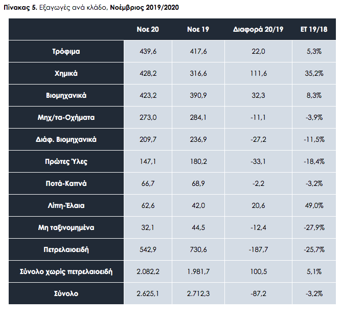 Πίνακας 5. Εξαγωγές ανά κλάδο, Νοέμβριος 2019/2020