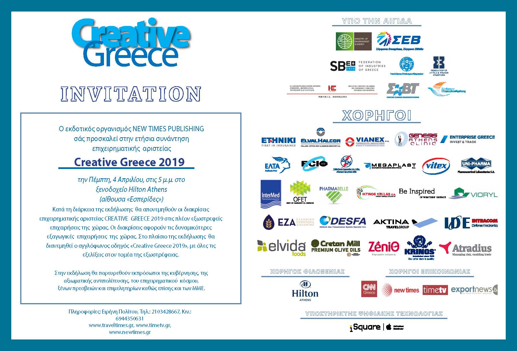 Στο πλαίσιο της εκδήλωσης θα διανεμηθεί ο αγγλόφωνος οδηγός “Creative Greece 2019”, με όλες τις εξελίξεις στον τομέα της εξωστρέφειας.
