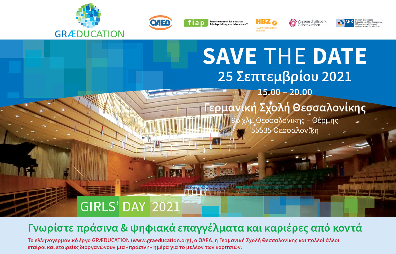 Στη Θεσσαλονίκη, Σάββατο 25 Σεπτεμβρίου και ώρα 15:00 με 20:00, στη Γερμανική Σχολή Θεσσαλονίκης, θα λάβει χώρα η δεύτερη σε σειρά εκδήλωση «Girls‘ Day – Ανακάλυψε τα πράσινα επαγγέλματα από κοντά», η οποία πραγματοποιείται στο πλαίσιο του χρηματοδοτούμενου από το Ομοσπονδιακό Υπουργείο Παιδείας και Έρευνας (BMBF) της Γερμανίας, έργου συνεργασίας GRÆDUCATION (www.graeducation.org).