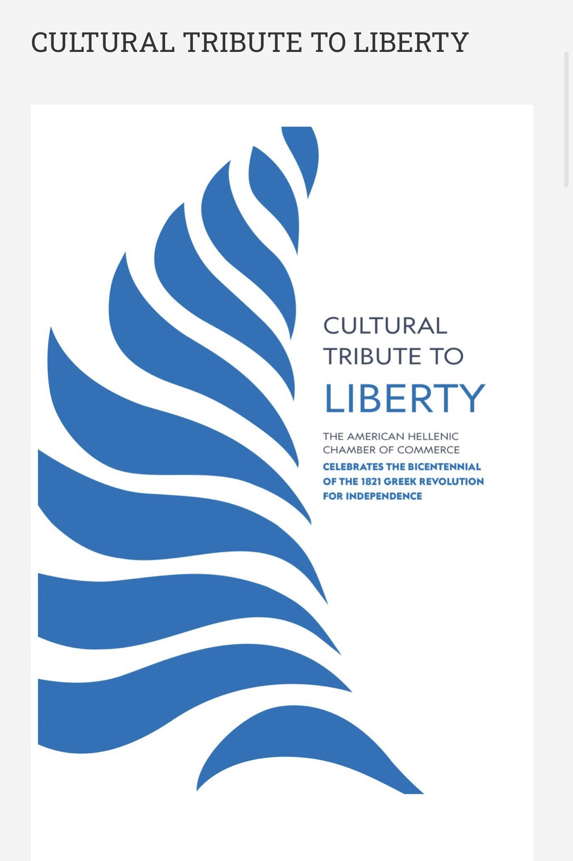 Το Ελληνο-Αμερικανικό Εμπορικό Επιμελητήριο, εορτάζοντας τα 90 χρόνια παρουσίας του στην Ελλάδα, εμπνέεται από την επέτειο των 200 χρόνων για την Ελληνική Ανεξαρτησία του 1821 και ξεκινά το έτος εορτασμού της επετείου των 90 ετών με ένα Αφιέρωμα Πολιτισμού στην Ελευθερία (Cultural Tribute to Liberty), που διοργανώνεται από τα μέλη της Επιτροπής Πολιτισμού του και με τη συμμετοχή έγκριτων φορέων, ιδρυμάτων και καλλιτεχνών, όπως το Ελληνικό Ίδρυμα Πολιτισμού (ΕΙΠ) και τον Δήμο Αθηναίων (Ολύμπια Δημοτικό Μουσικό Θέατρο «Μαρία Κάλλας» – πρώην Λυρική Σκηνή).